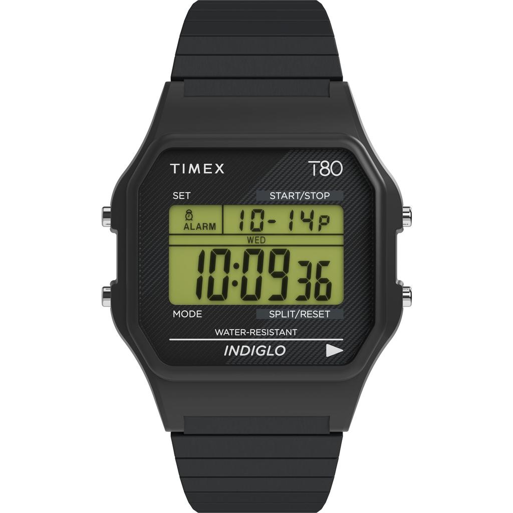 Black 34mm resin case with acrylic lens, gray digital display.