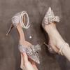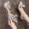 Bow Crystal Shoes Women's Pointed Toe Shallow Mouth Pearl One Strap Non-Tired Feet Beaded Non-Slip Single Shoes