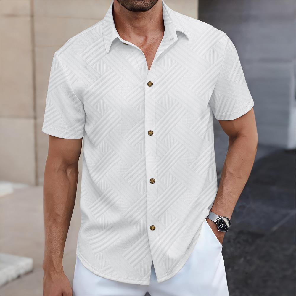Men's Spring/Summer New Solid Color Jacquard Collar Cardigan Buckle Casual Short Sleeve Shirt Top