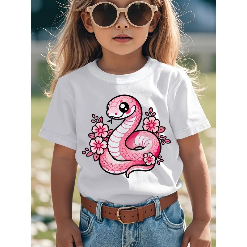 European Sizes Kawaii Pink Snake and Flowers Year of Snake Funny Awesome Graphic Kid T-Shirt | Casual Streetwear Tees Tops for Kids