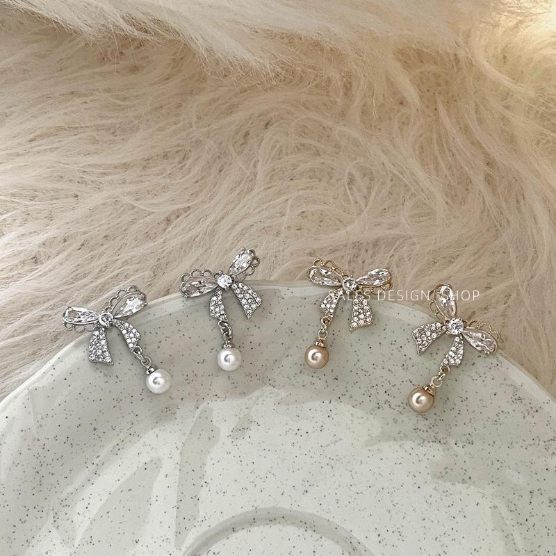 Korean Zircon Bow Pearl Stud Earrings - High-End, Versatile & Elegant.