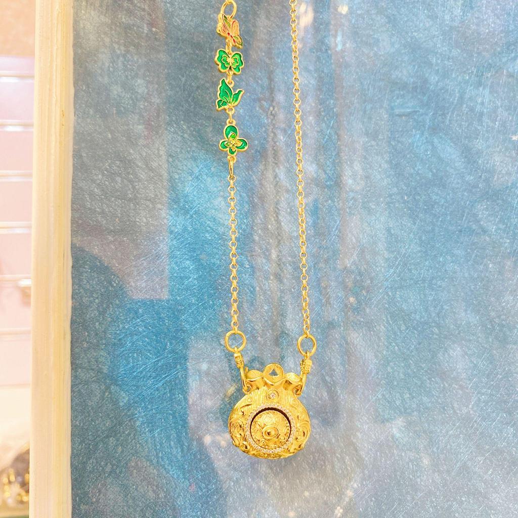 Sand Gold Rotatable Coin Pendant Necklace with Diamond Inlay - Chinese Style Money Bag Sweater Chain for Women