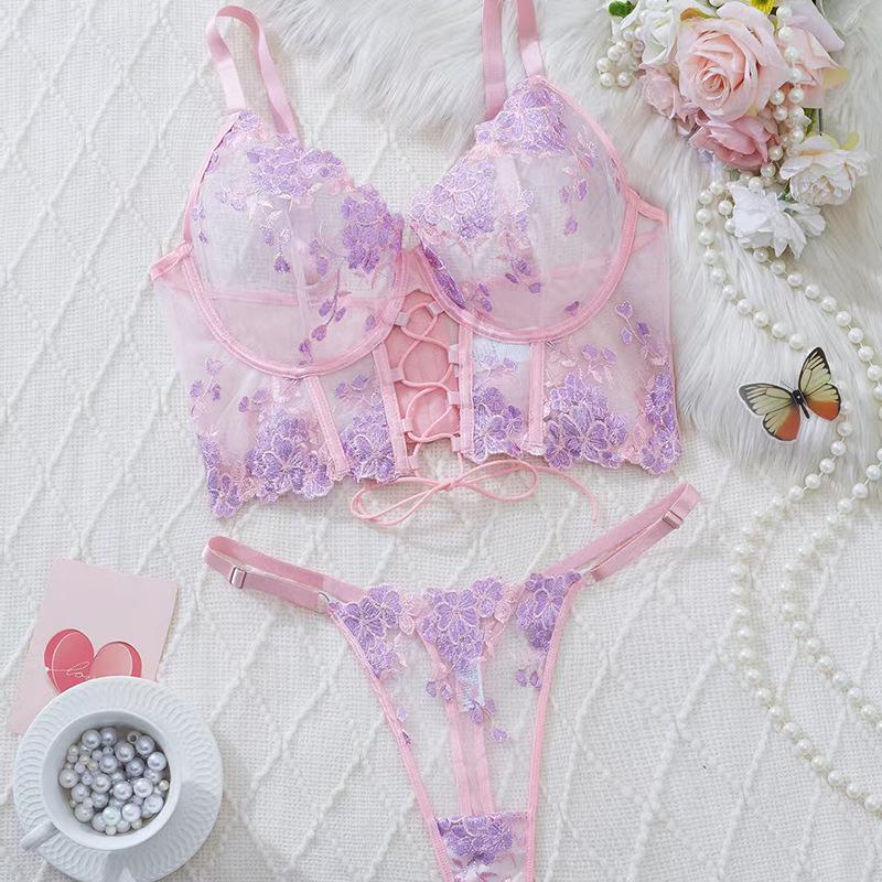 European & American Floral Lace Strappy Lingerie Set - Pink & Purple Push-Up Mesh