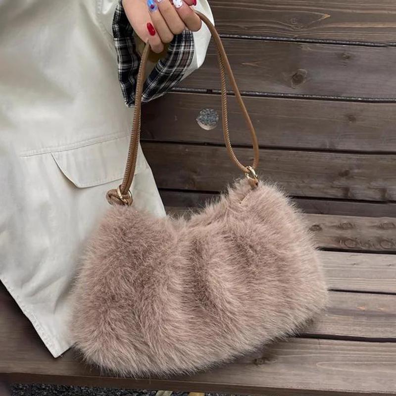 Fluffy Faux Fur Shoulder Bag Women Soft Elegant Underarm Bag Thin Shoulder Strap Plush Handbag Winter Versatile Commuter Totebag