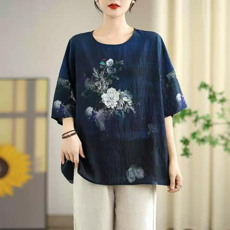 Large Size Retro Cotton and Linen Printed Half-sleeved T-shirt Women's Summer Loose Fat Mm Cover Belly and Thin Western Style Top