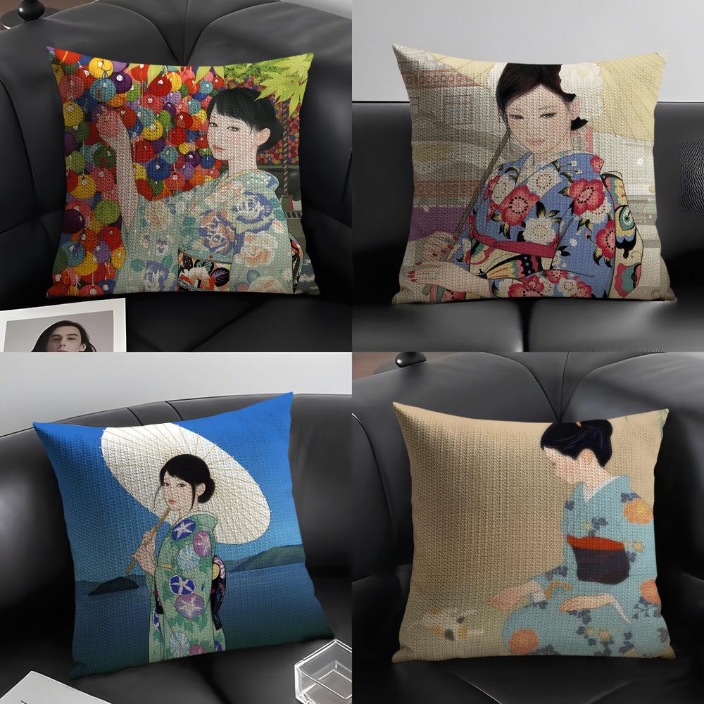 Kimono Girl Japanese Style Cushion Cover Natural Linen Organic Fabric DoubleSided Printing Sofa Home Decor Gift Pillow Case