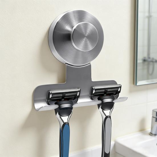 This suction cup shaver holder offers a secure, damage-free mount on smooth, non-porous surfaces like glass, tile, and mirrors with its reinforced suction cup design, supporting up to 11 lbs. Made from rust-proof stainless steel, it features a moisture- and fading-resistant finish for long-lasting durability. The integrated suction base and locking mechanism ensure stable placement without tools, drilling, or adhesives. Installation is quick, residue-free, and the holder is removable and reusable without leaving marks.