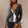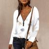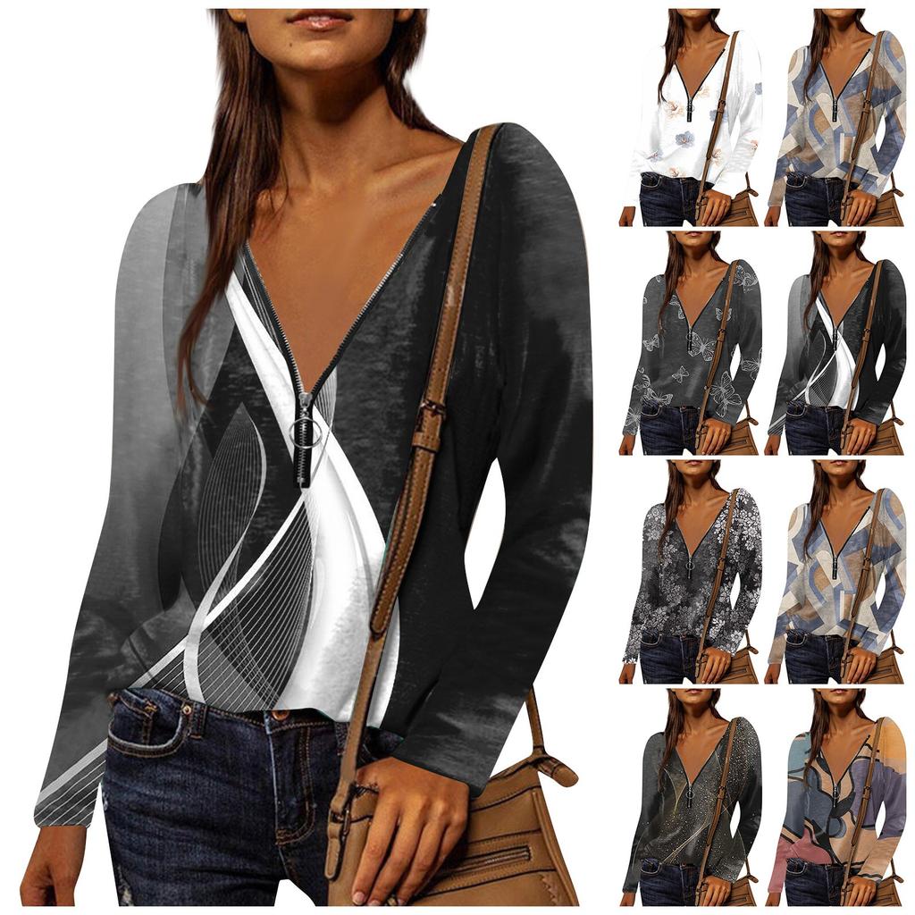 Women's Shirt Blouse Casual Loose Shirts Print Long Sleeve V Neck Zipper T-shirts Tee Pullover Tops