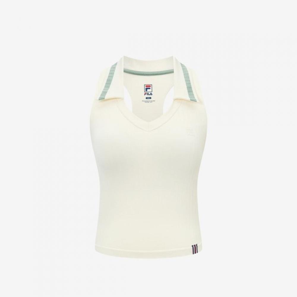 The FILA CASA FILA Collared Tank Top is a ribbed bra top made from nylon spandex yarn. It features a short collared style and a slim fit design with sleeveless arms. With its antimicrobial properties and sturdy texture, it supports the bust line while showcasing FILA's signature style. This product is suitable for sports activities for the 24 season.