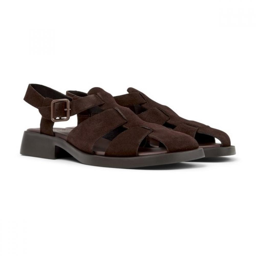 The Camper Dana women's sandals are brown sandals made of calfskin suede. They feature OrthoLite® Recycled memory foam and an XL EXTRALIGHT® EVA outsole for exceptional comfort and lightweight quality. The modern design makes them suitable for various everyday styles.