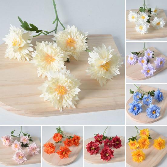 This artificial chrysanthemum flower features a clear, soft texture that mimics the velvety, three-dimensional feel of real blooms. Each branch holds five flower heads arranged naturally with lifelike green leaves, creating a full, rich bouquet without extra additions. Perfect for vase displays, flower walls, or pathway decorations, it adds a retro and elegant touch to any space.