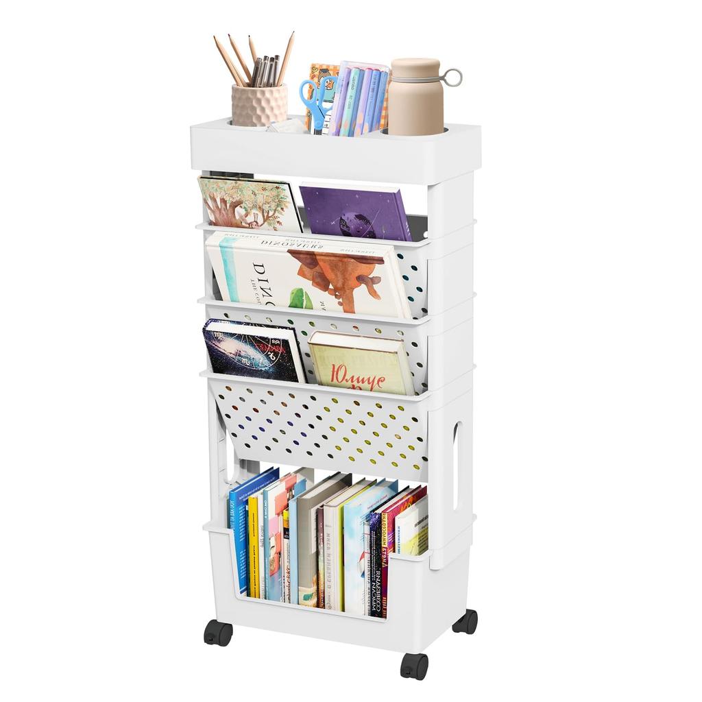 【Multifunctional Zoning】As a 5-tier file cart, each shelf has a load capacity of approximately 15kg, and each shelf offers various functions. First, the top shelf has a round groove suitable for water bottles, and of course, it's also perfect as a pen holder. The practical 3 shelves neatly store textbooks, comics, picture books, magazines, files, CDs, and more. The bottom has ample space to store anything that fits.
