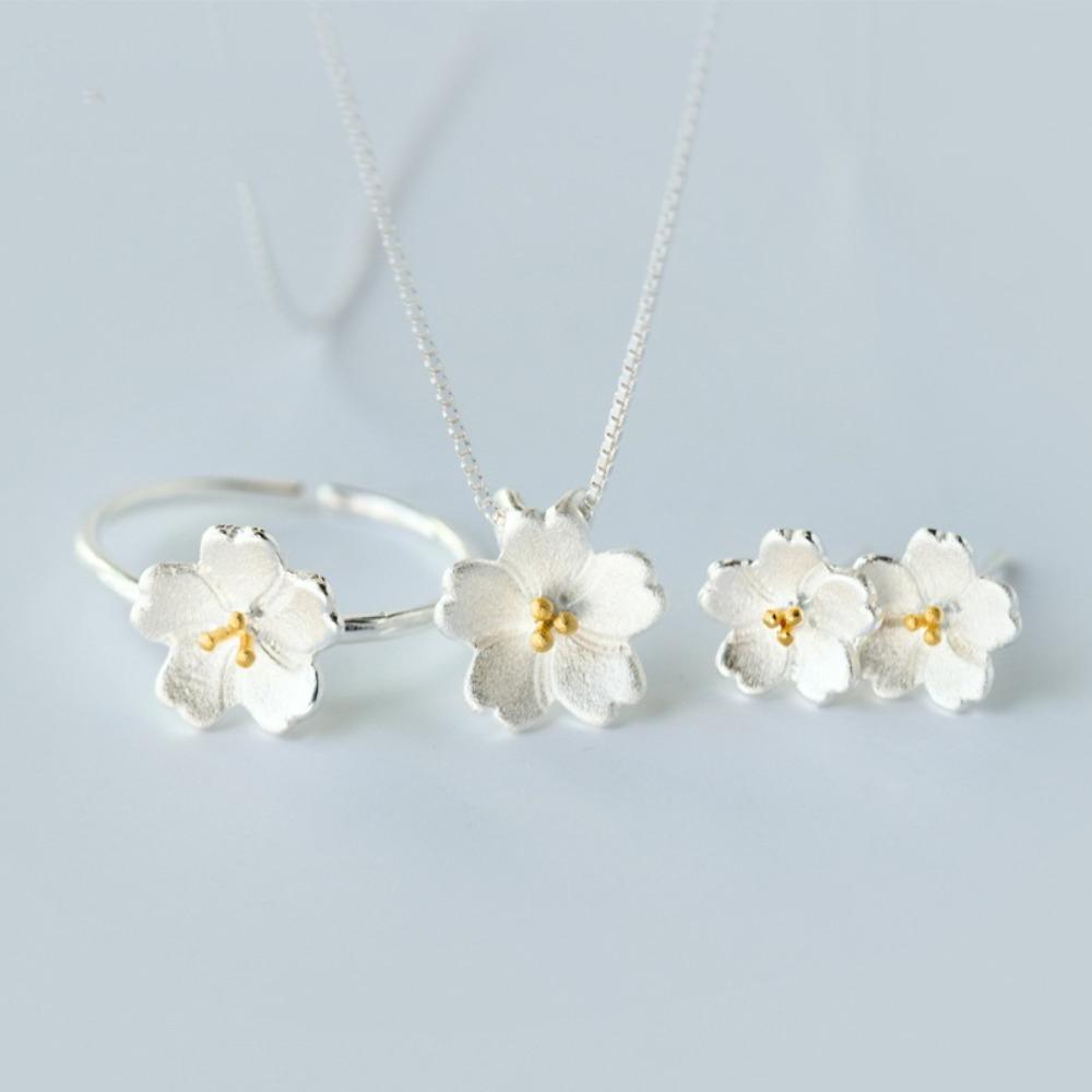 Women Silver Cherry Blossom Ring Open Adjustable Minimalist Classic Jewelry Set Elegant Floral Design