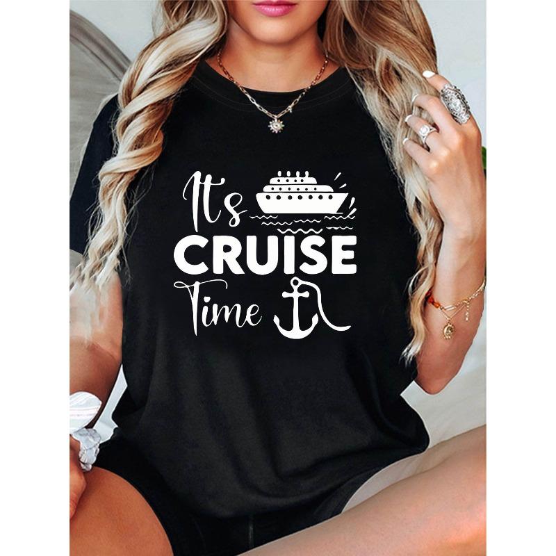 Plus Size, It's CRUISE Time Graphic Print Plus Size Women's T-shirt, Short Sleeve Crew Neck Casual Top for Summer & Spring, Women's Clothing