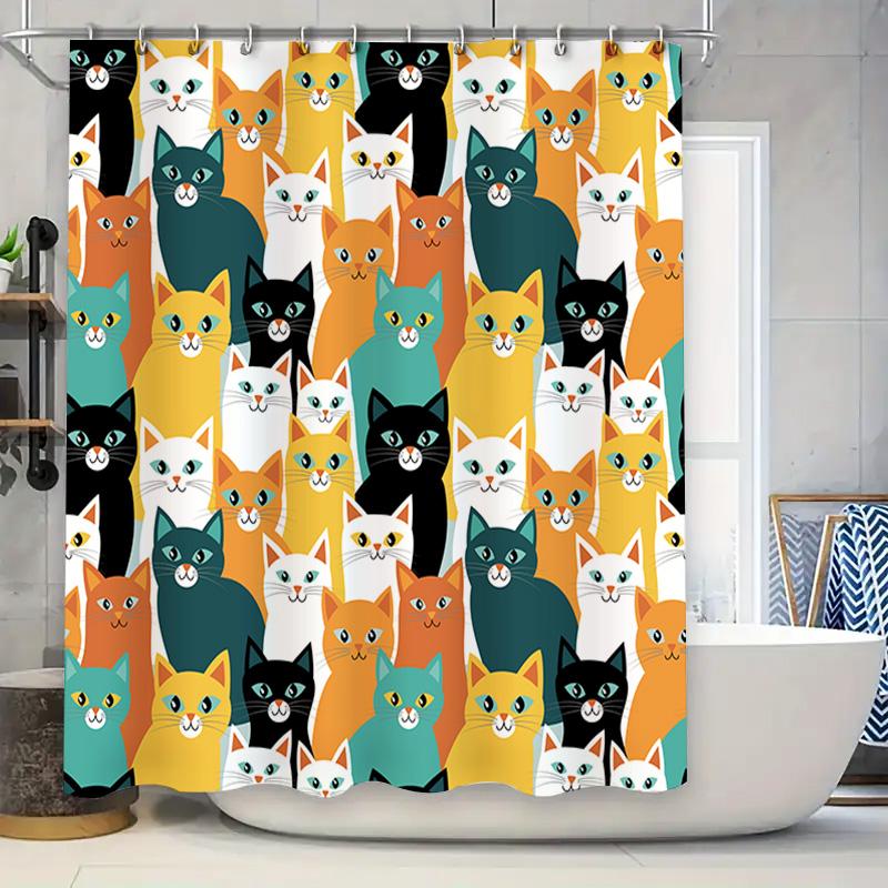 Colorful Cat Print Shower Curtain for Bathroom Decor Modern Pattern Fabric Shower Curtains with Hooks Set In Green, Yellow, Oran