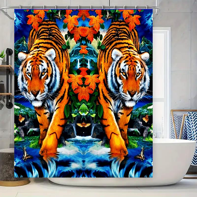 Tiger Print Shower Curtain Waterproof Home Decor Bathroom Rug Mat Modern Orange Floral Design for Kids Bedroom Decoration (Size: