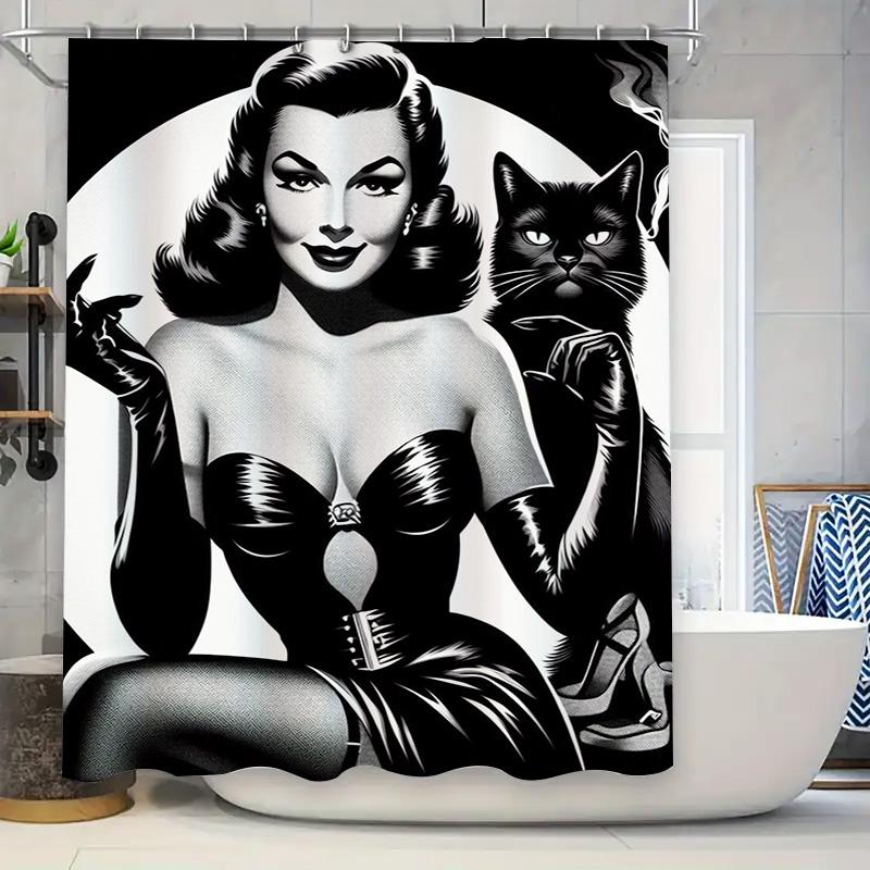 Vintage Retro Style Cat Lady Shower Curtain Classic Black White Print Bathroom Decor Perfect Gift for Women's Day