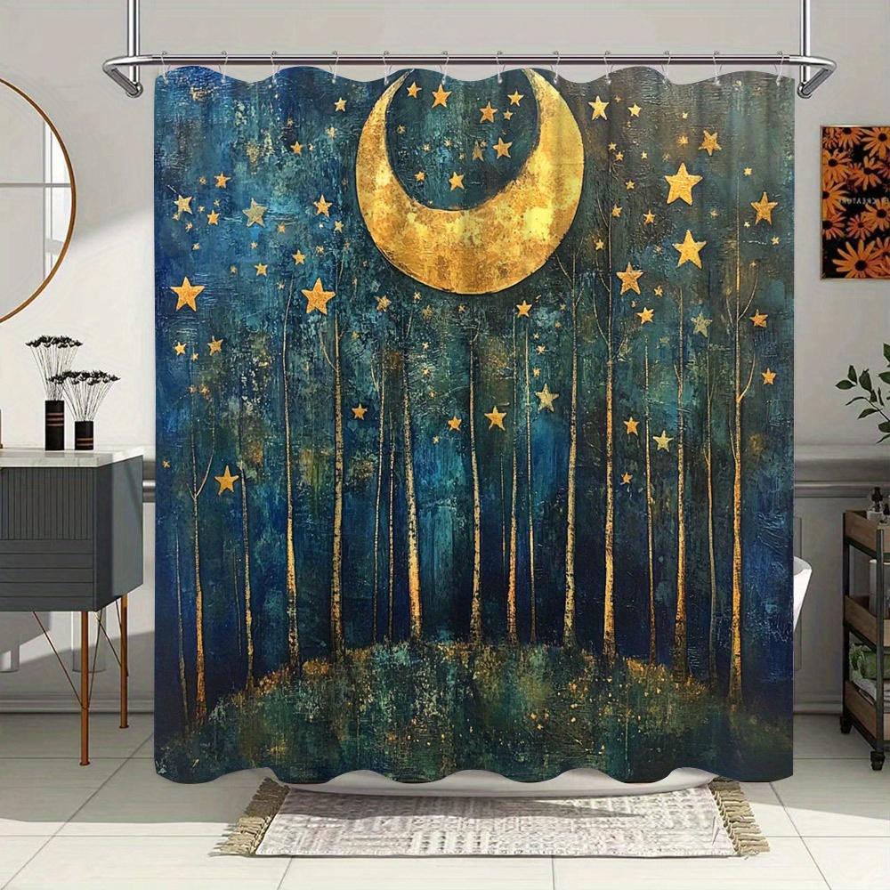 Mystical Forest Starry Night Shower Curtain - Golden Crescent Moon, Dreamy Polyester, Perfect for Bathroom or Patio Decor