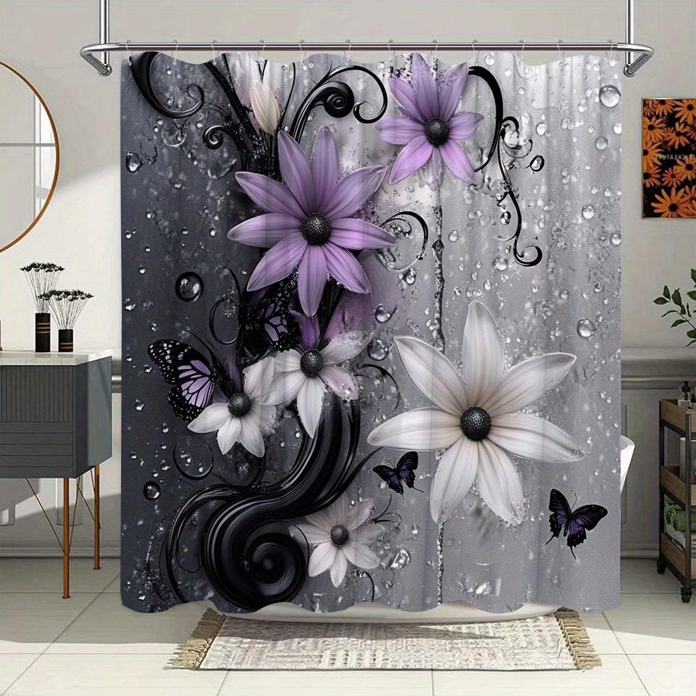 Fantasy Floral Shower Curtain - Lavender & White Flowers, Purple & Black Butterflies, Metallic Silver Background, Polyester,