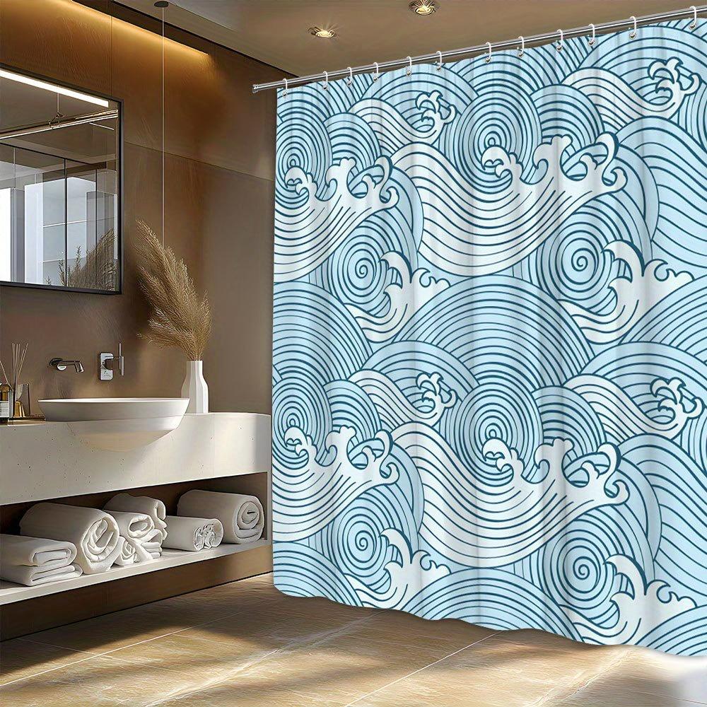 1pc Japanese Art-Inspired Blue Waves Shower Curtain - 70x70", Dynamic Design, Includes 12 Hooks