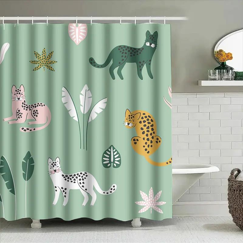 Animal Print Shower Curtain, Cat Design, Green Floral Pattern, Polyester Waterproof Fabric, Modern Bathroom Decor Unique Home Ac