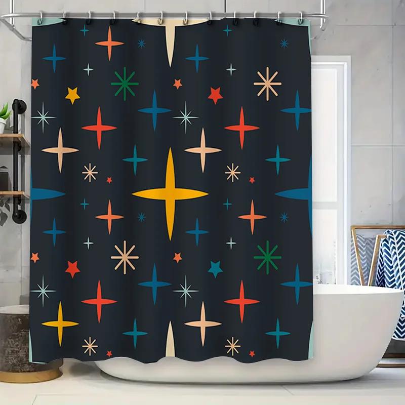Vintage Stars Shower Curtain Modern Bathroom Decor, Navy Blue Background with Red, Yellow, Green, Orange Teal Star Pattern