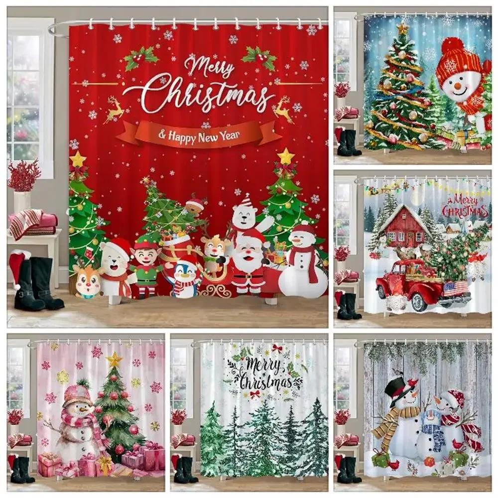 Merry Christmas Bathroom Curtains Snowman Christmas Tree Gift Red Truck Polyester Fabric Washable Shower Curtain Bathroom Decor