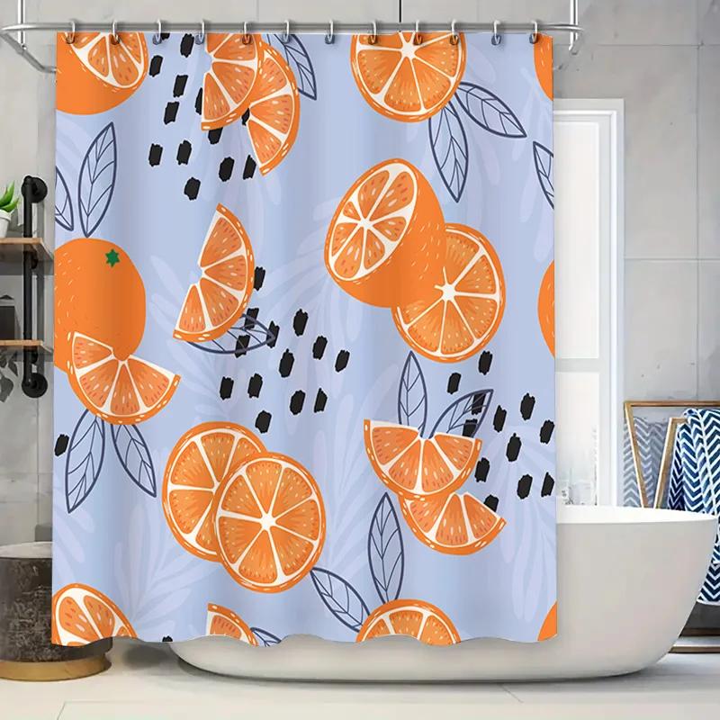 Vibrant Orange Slice Shower Curtain for a Fresh Bathroom, Featuring Juicy Oranges and Leaves On a Light Blue Background