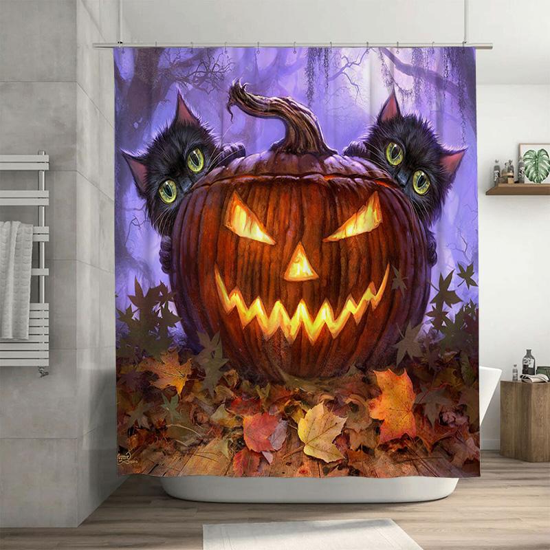 Halloween Pumpkin Cat-themed Shower Curtain Made of Polyester Fabric with Waterproof Printing for Home Bathroom Decor Accessorie