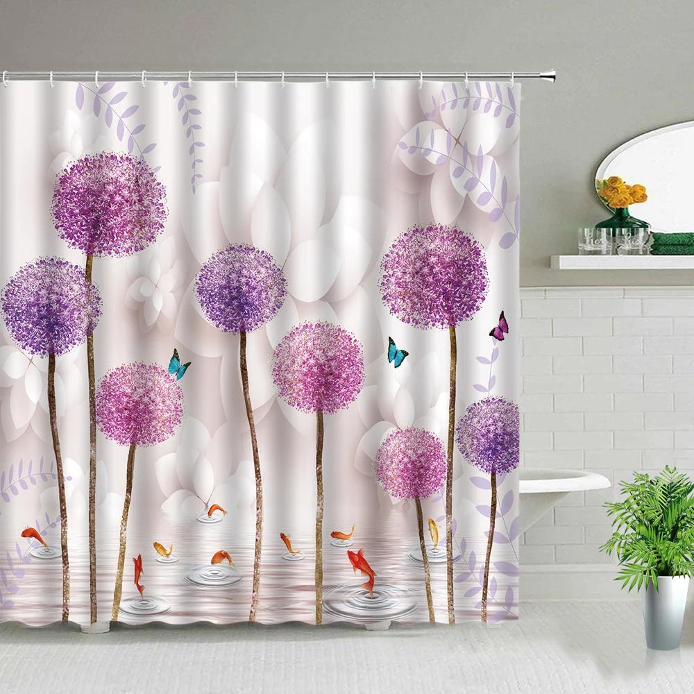 Flowers Plant Shower Curtains 3D Simple Purple Dandelion Flower Printing Polyester Home Decoration Waterproof Bathroom Curtain