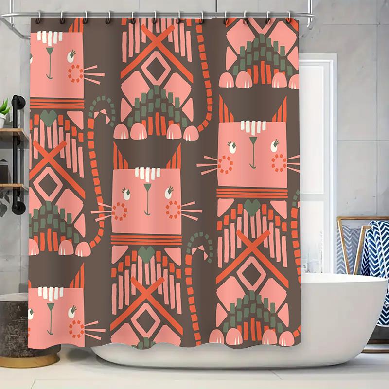 Vintage Geometric Cat Shower Curtain Pink Brown Modern Boho Decor Bathroom Fabric Hanging Waterproof Wall Covering with Hook Unp