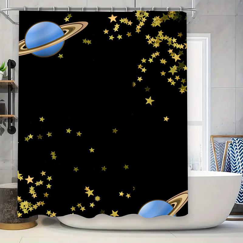 Space-themed Bathroom Decor: Blue Planet with Rings Shower Curtain Featuring Gold Stars for a Cosmic Ambiance In Your Bathtub Ar