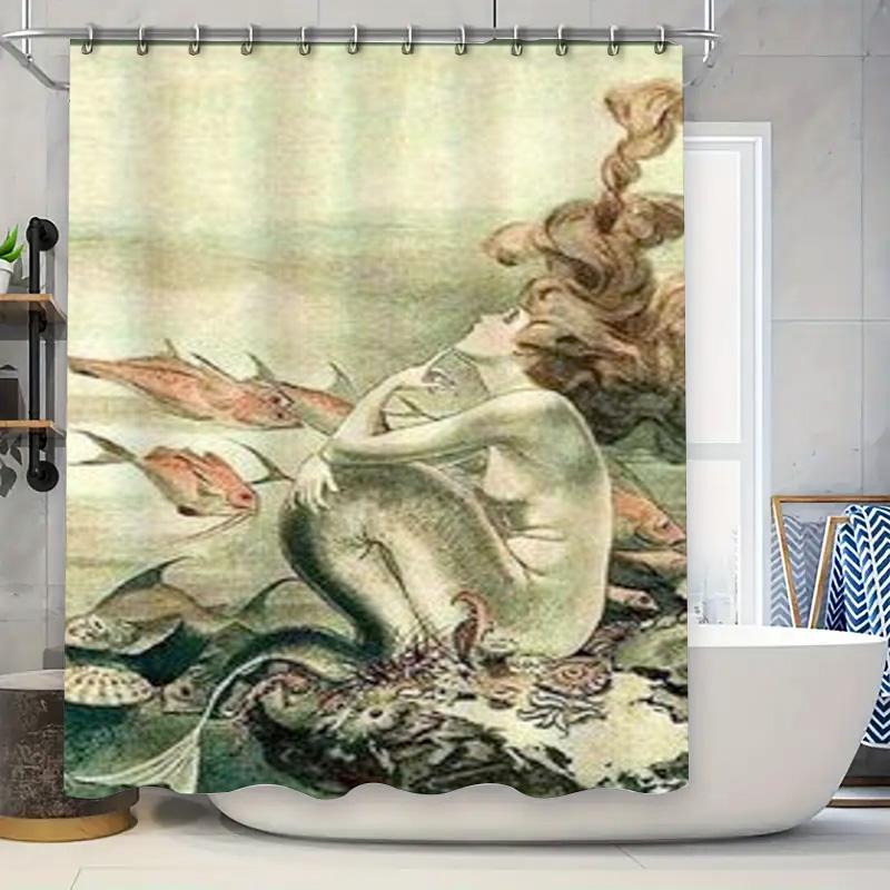 Vintage Mermaid Shower Curtain with Fish Design Waterproof Fabric Decor for Bathroom