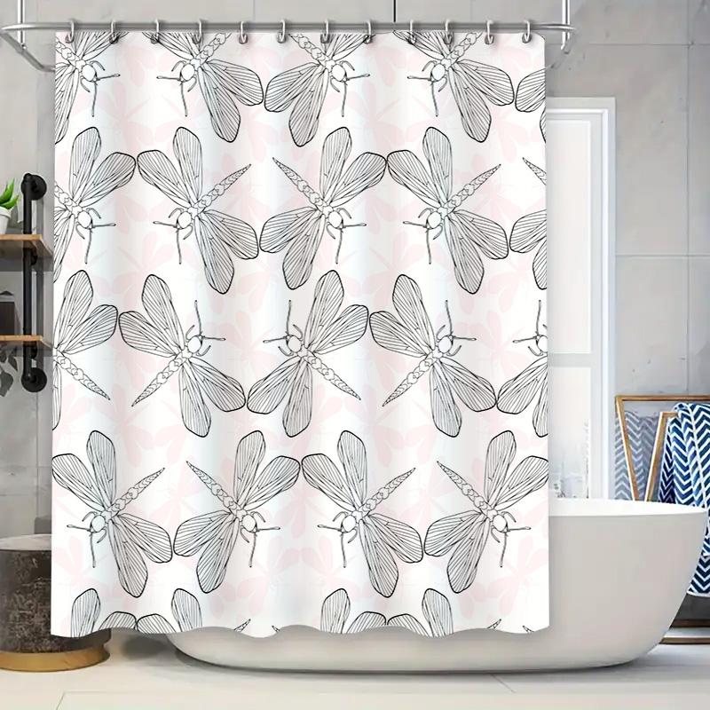 Modern Floral Dragonfly Bath Shower Curtain Set Decor Collection White Black with Rod Holders Included for Bathroom Decoration A