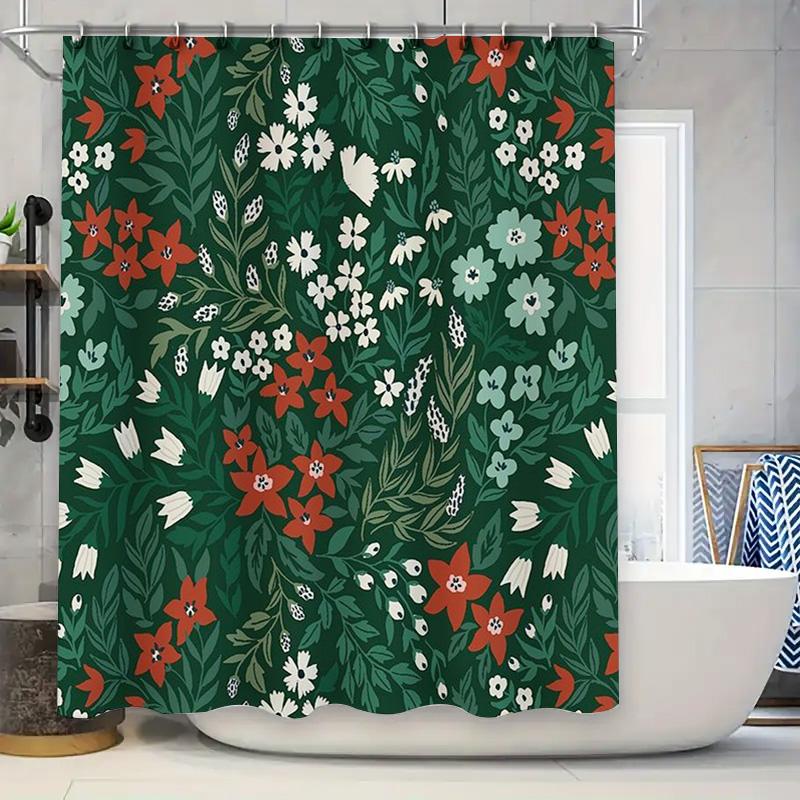 Green Floral Shower Curtain Decor Waterproof Fabric Bath Room Decoration for Home Bathroom Red White Flowers Green Leaf Pattern