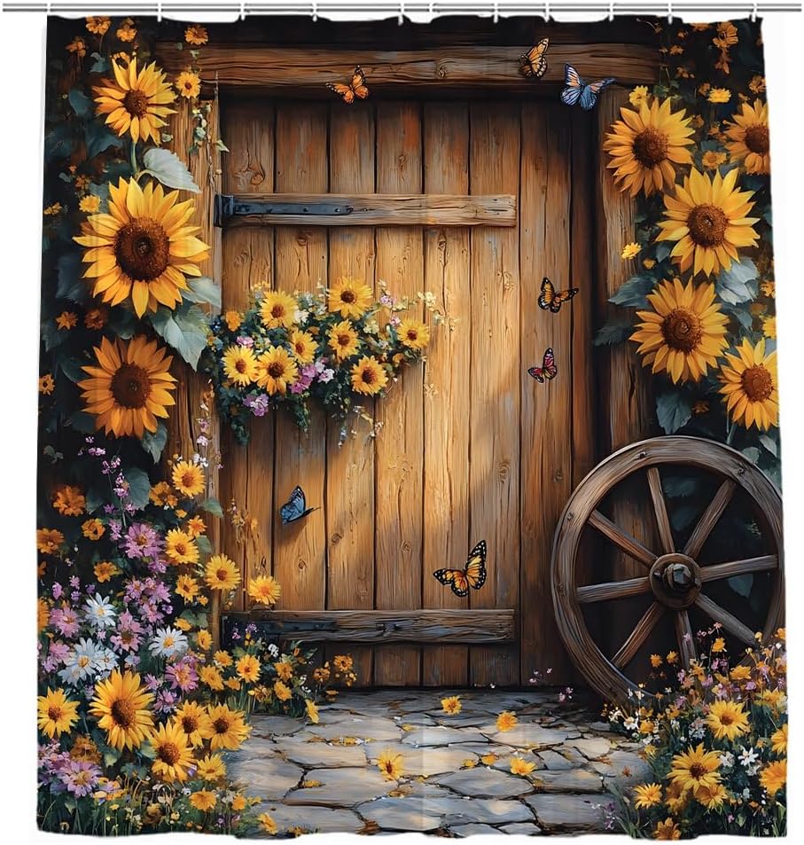 Rustic Barn Door Shower Curtain Autumn Sunflower Floral Farmhouse Vintage Western Brown Wooden Board Yellow Flower Butterfly