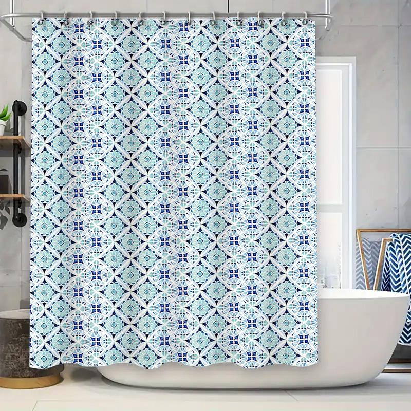 Blue White Geometric Shower Curtain with Floral Pattern for Bathroom Decorations Customizable Sizes Available On Perf