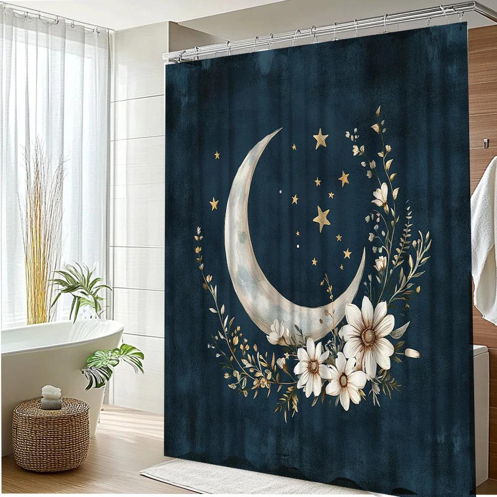1pc Moon and Stars Shower Curtain with Floral Accents - Navy Blue Celestial Design, Premium Polyester Fabric 180x200cm
