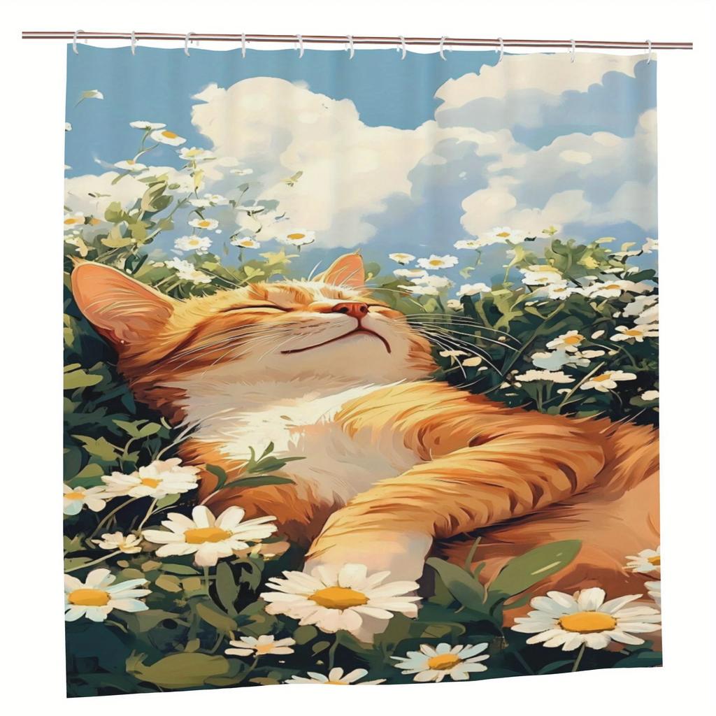 Charming Cat In Daisy Field Waterproof Shower Curtain - Serene Nature Design, Easy To Clean, Durable Fabric for Bathroom Decor