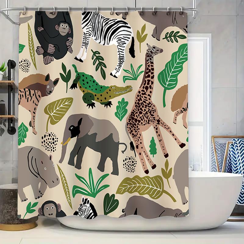 Animal Adventure Shower Curtain Jungle Safari Theme with Zebra, Giraffe Elephant Design Waterproof Fabric for Bathroom Decoratio