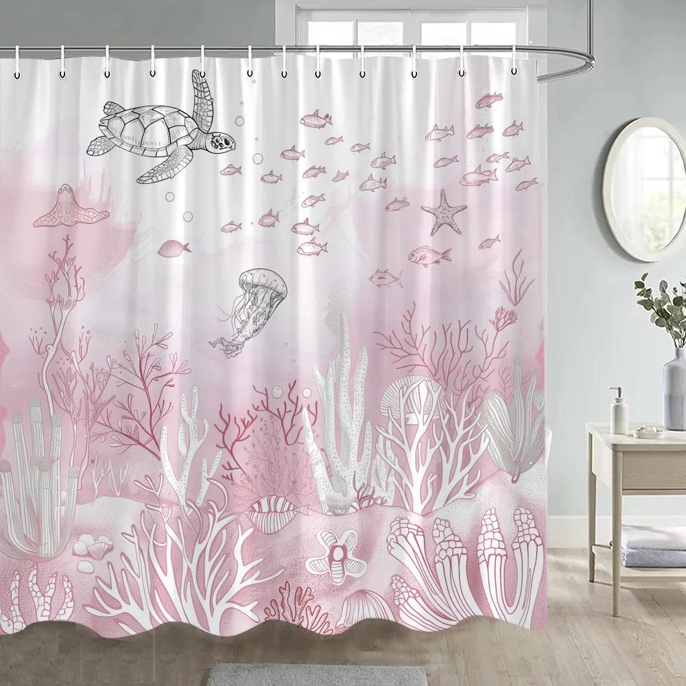 Pink Nautical Shower Curtain Sea Turtle Ocean Animal Coral Undersea Summer Modern Polyester Bath Curtain with Hook Home Decor
