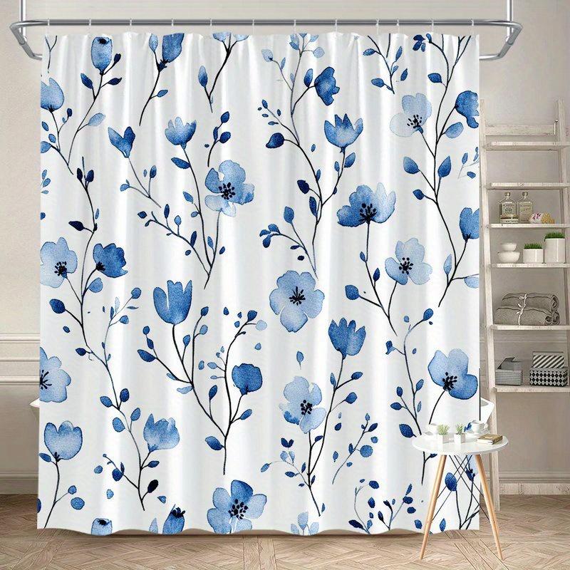 1pc Blue Floral Shower Curtain -Simple Watercolor Design with Gradient Petals and Oval Leaves Polyester Fabric, Machine Washable