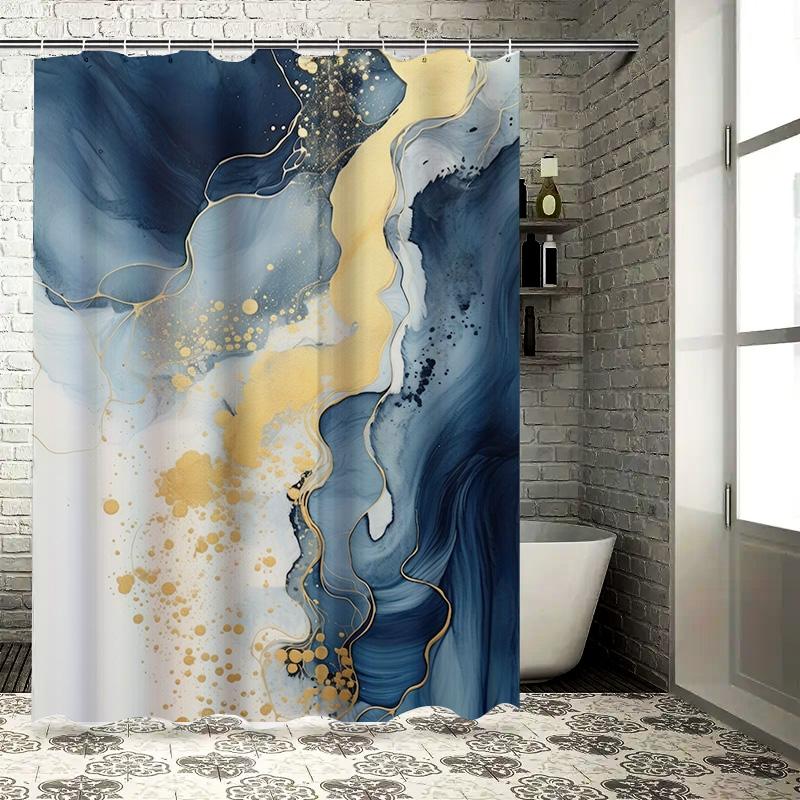 Luxury Blue White Shower Curtain with Metallic Gold Foil Black Swirl Design for Bathroom Decor Artistic Bath Mat Set by TaurusDu