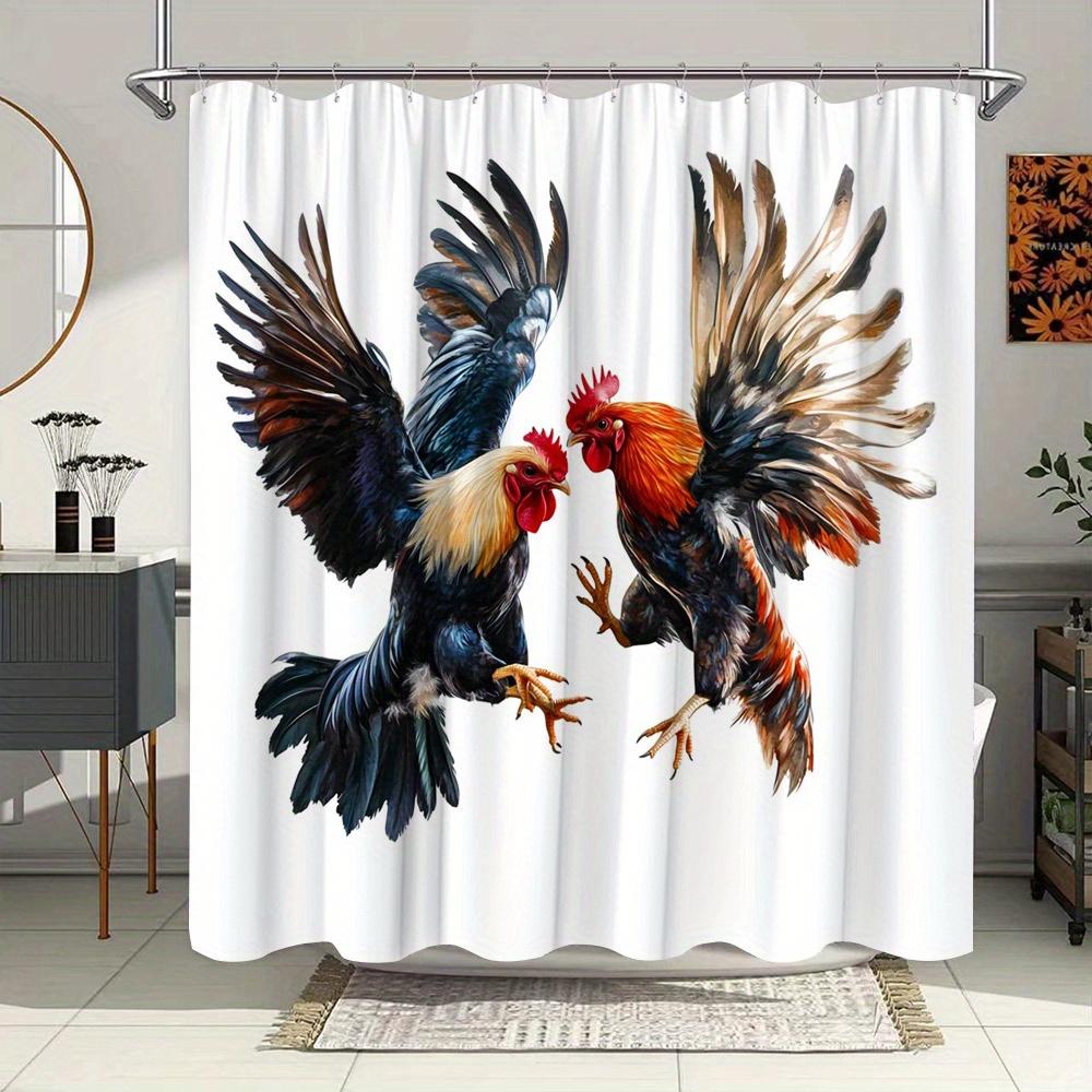 Vibrant Rooster Duo Mid-Air Digital Art Shower Curtain, Polyester Woven Fabric, Forest Theme with Detailed Feathers,