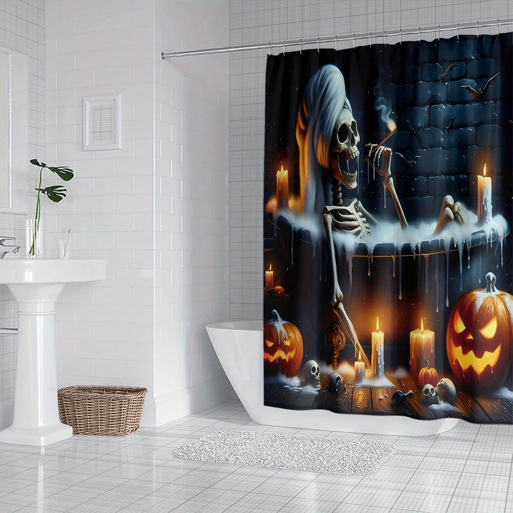 Halloween Skeleton Tub Shower Curtain, Fog-Proof Polyester, Dripping Candles & Jack-o'-Lanterns, All-Season Decor