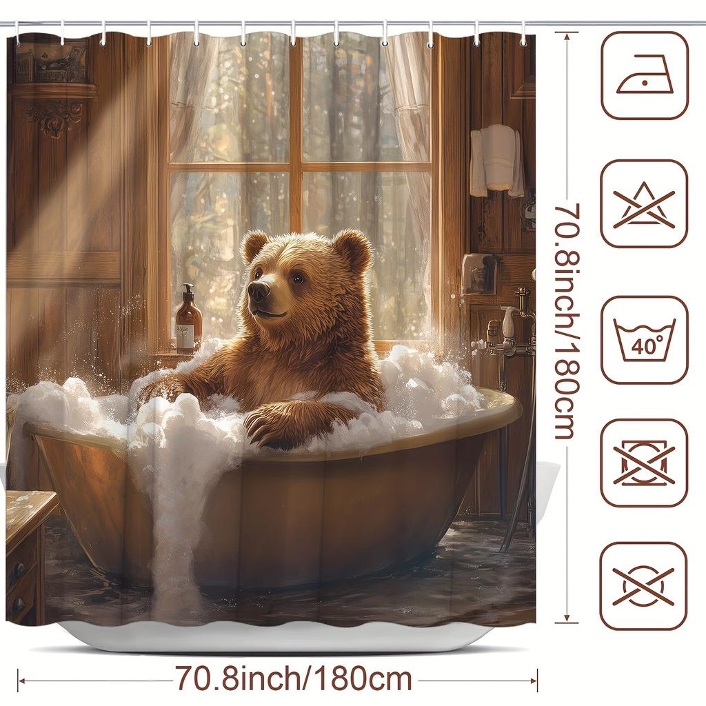 1pc Bear Shower Curtain - Funny Brown Bear Bathing, Rustic Wood Grain, Country Cartoon Design, Modern Bathroom Decor