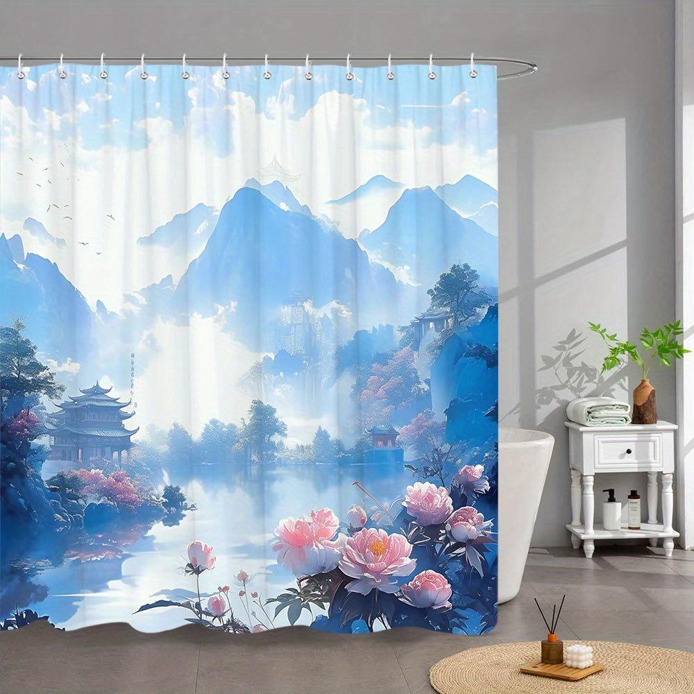 1pc Fantasy Landscape Bath Curtain - Misty Blue Mountains, Pink Cherry Blossoms & East Asian Pagodas Reflective Lake Ethereal
