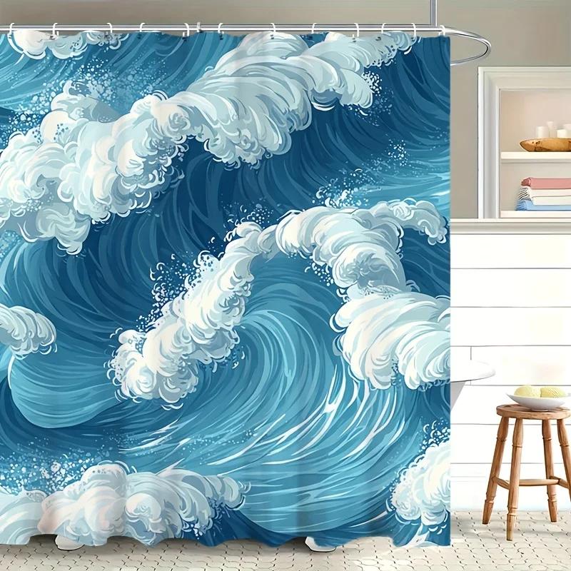 1pc Ocean Themed Shower Curtain with Plastic Hook, Durable Polyester Fiber, Machine Washable Bathroom Decorative Shower Curtain