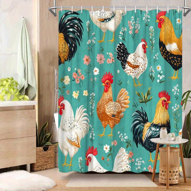 1pc Chicken Pattern Shower Curtain - Teal Background, Pink & Yellow Flowers, Detailed Feathers, Hand-Painted Look, 70.8x70.8"