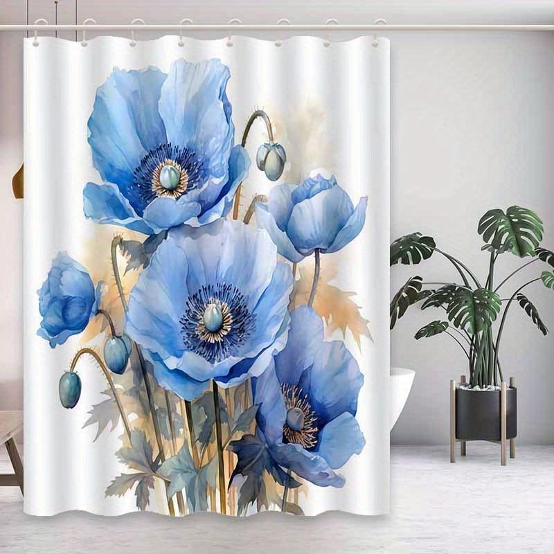 1 Piece Blue Watercolor Floral Shower Curtain, Polyester Fabric, Machine Washable, Suitable for Bathroom Decoration